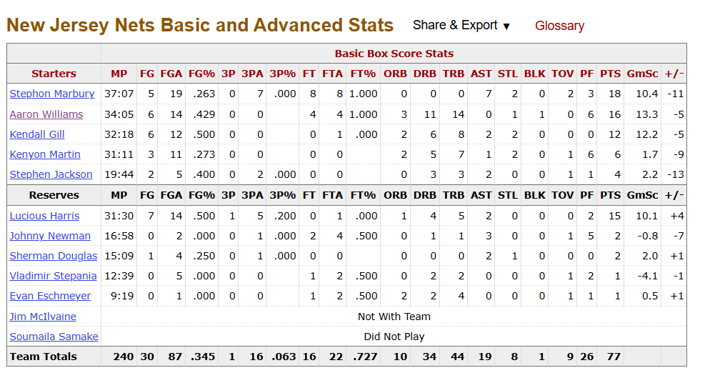 This is the box score from the game we covered for our various websites, at court level, where media sat in 2000-01. This is the Nets team Raftery had to work with: