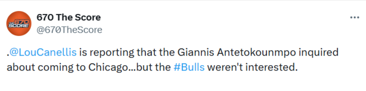 They aren't. And they won't, like I would, swap Josh Giddey and (the out-for-the-season) Noa Essengue and Jalen Smith and Nikola Vucevic and Zach Collins and every pick the Bulls have for Giannis and Myles Turner.